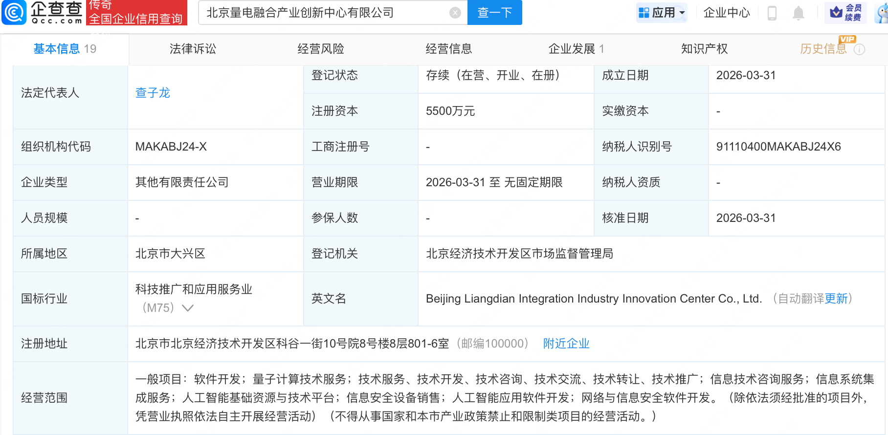 企查查APP显示,近日,北京量电融合产业创新中心有限公司成立,注册资本5500万元,经营范围包含:量子计算技术服务;人工智能应用软件开发;网络与信息安全软件开发等。企查查股权穿透显示,该公司由中国电信(601728.SH)全资子公司中电信量子信息科技集团有限公司、中兴通讯(000063.SZ)、摩尔线程-U(688795.SH)全资子公司北京摩笔生成科技有限公司等共同持股。