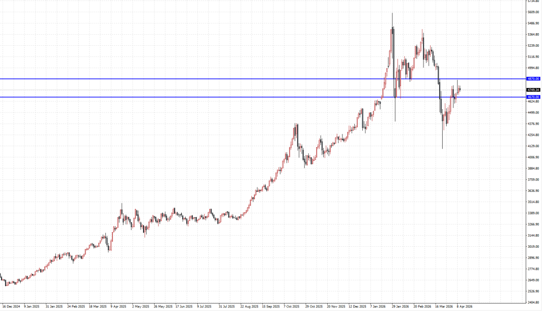 综合而言,美国总统特朗普针对伊朗的行动引发市场对战争风险的重新评估,脆弱的停火协议虽带来短暂风险偏好回暖,但伊朗方面对协议执行的抱怨以及美国和以色列的强硬表态,持续压制市场乐观情绪。整体盘面显示,黄金短期获得一定支撑,但地缘不确定性仍令多头维持谨慎。与此同时,地缘政治因素与风险情绪联动显著。美伊两周停火协议虽暂缓冲突,但伊朗关闭霍尔木兹海峡的举动以及后续谈判的不确定性,仍推高油价波动。恐慌指数VIX波动率保持敏感,美股尤其是纳斯达克在风险偏好回暖时为美元指数提供间接支撑,但任何停火破裂迹象都可能迅速推升美元避险买盘,从而对黄金构成新一轮压制风险。此外,对于美联储而言,高企的通胀预期无疑加大了政策决策的难度:若通胀持续粘性,美联储或被迫维持高利率政策更长时间,甚至不排除进一步加息的可能;这一预期让市场难以重新构建“美联储将很快启动降息”的明确逻辑,进而从利差角度限制了美元的下行空间。此外,市场仍需关注三大不确定性变量:伊朗方面的导弹威胁是否会持续、霍尔木兹海峡的航运风险能否彻底解除、以及此次停火协议能否突破“短期化”困境。多重风险叠加之下,交易员并未彻底放弃对美元的配置,避险买盘的“安全垫”仍未完全消失。从运行逻辑的角度,黄金的“更大级别上行叙事”仍可成立,但短期需要面对的不是“有没有利多”,而是“利多是否已经被计价,以及流动性是否允许价格顺畅表达”。当保证金与成交结构发生变化时,价格的波动常常比消息本身更能体现市场的真实压力。若后续流动性收窄、波动收敛,黄金更容易重新回到以宏观利率预期为主导的定价轨道;反之,若不确定性升温或规则变化继续扰动,震荡幅度也可能维持在偏高水平。眼下这轮修复更像是技术性再平衡,而非对黄金长期逻辑的肯定。同时既是在消化避险流动性与规则调整带来的短期冲击,也是在等待下一轮宏观与风险变量给出更清晰的方向线索。技术层面上,多头若要维系黄金多头动能修复姿态,则需位于4870美元区域之上巩固底仓,并通过量能与动能共振推动二次上攻,才将有望带动金价回归测试5000美元关口。与此同时,若市场买方期望达成新一轮看涨共识,则需在击穿5000美元关口阻力后,才有望带动金价进一步回升至5200美元区域上方。然而,需要谨慎的是,中东地缘政治紧张局势引发能源中断对全球供应链的连锁反应,这将可能放大通胀实际效应对美联储政策路径影响,从而强化黄金短期空头局面。总体而言,中东冲突的持久性和油价波动交织美国数据不确定性,使得黄金短期面临美元主导的回落风险。此外,从市场定价看,目前利率衍生品市场预计到2026年12月前美联储降息押注已几乎消失。如若美国后续经济数据显示韧性,叠加通胀实质性抬升,则美联储在更新利率路径时口风维持“鹰派”,那此前市场宽松预期就需要被完全“撤回”,收益率曲线将发生“鹰派再定价”。在这一过程中,美元指数将成为受益方。与此同时,如果交易员开始相信“降息底部已现”,那么此前积累的悲观交易将面临回补压力,从而也将导致金价后续再面临更深层次技术性回撤风险。因此,黄金如若在短期内回收至4670美元区域下方,则空头定价预期强化价格进一步回撤至4560区域进行新一轮修正的风险将被放大。更为值得谨慎的是,如若4560美元附近区域未能提供实质性支撑,则后续金价将面临进一步回撤至4480美元下方的风险加剧。