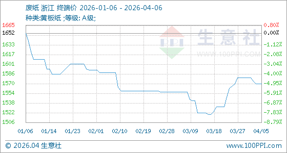 4月6日,生意社废纸基准价为1570.00元/吨,与本月初(1580.00元/吨)相比,下降了0.63%。