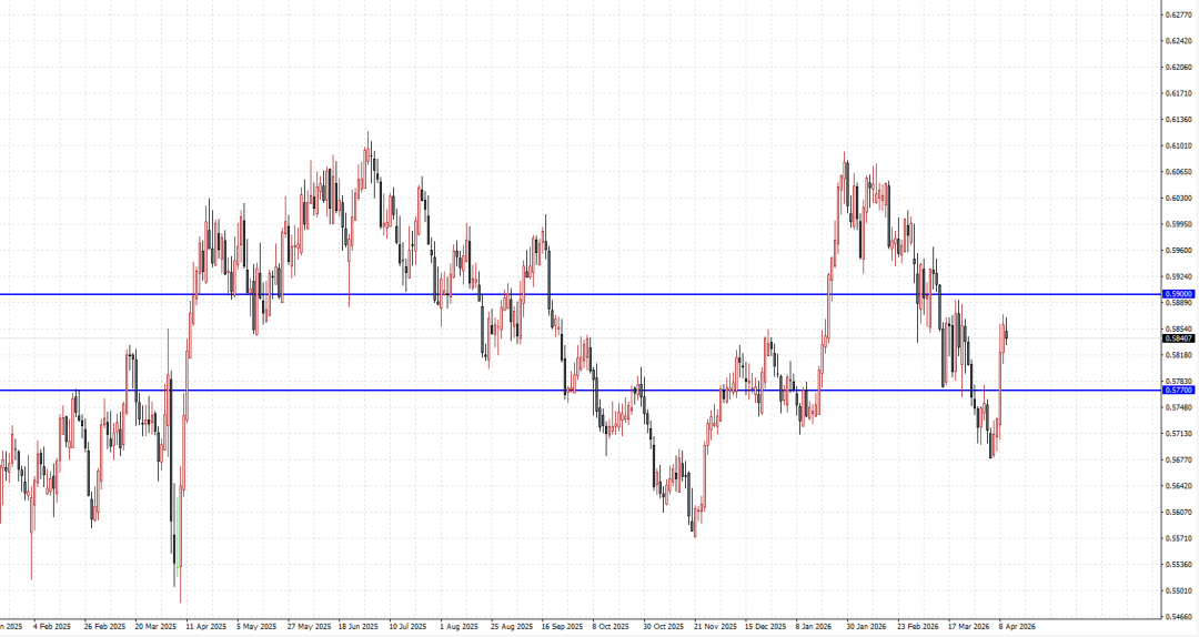 综合而言,尽管美伊达成两周停火协议以及恢复霍尔木兹海峡运输航道为纽币价格回升提供核心驱动力,但纽币与美元仍处于“双向拉扯”的格局中:一方面,停火协议带来的避险情绪退潮,削弱了前期驱动美元上涨的核心动力,为纽币回升提供空间;而另一方面,持续高涨的通胀预期又足以阻止市场对美联储货币政策转向全面鸽派,为美元提供隐性支撑。当前市场关注方向将主要取决于两大关键条件:其一,此次停火协议能否持续生效,中东地缘冲突是否会再次升温;其二,后续美国通胀数据是否会呈现回落态势。若这两大条件均满足,停火持续且通胀降温,美元指数或有望进一步下探;反之,一旦地缘冲突重启或通胀数据超预期走强,美元的避险买盘和利差支撑可能快速回归,推动指数再度反弹,从而对纽币构成新一轮压制力。美元一侧则呈现出一种“相对强势”的结构。如若美国后续经济数据显示韧性,美联储口风再度强化“鹰派”基调,则市场对于其年内降息预期的定价将被完全“撤回”,为美元指数走强提供底座。当前,交易员仍会持续关注两类信息是否能提高信噪比:一是后续更完整的通胀与消费端细项,验证2026年初价格变化究竟更多来自能源与季节性因素,还是更广泛的核心项抬升;二是美联储官员对“通胀与就业权衡”的表态,尤其是对通胀持续性、就业松动程度以及政策反应函数的阐释。如果数据连续性恢复且核心通胀保持韧性,市场对“利率维持更久”的定价可能更稳,美元指数的下行门槛将有所抬升;若后续证据显示价格压力继续缓和且增长动能放缓更清晰,美元指数则可能继续处在偏弱框架里运行。无论哪种情景,今日这类“信息不完备”的关键数据更像是一次压力测试:测试市场对美元叙事的依赖程度,也测试风险资产与主要货币对利率路径变化的耐受度。技术层面显示,纽币盘口整体反馈体现为:RSI指数进入55-45强弱平衡区,表明当前市场多空双方力量进入相对均衡阶段,同时提示汇价整面临新一轮方向性选择临界点。因此,技术面显示多头需防范如若纽币后续未能成功守稳0.5770一线区域,则将显示动能反弹持续性再度趋弱,量价关系偏向“量能前导型”下跌,即缩量反弹而放量下行的风险倾向仍存。因此,尽管多头在当前维系一线支撑,但后续上行优势位于0.5900区域下方仍需保持相对谨慎。短期内需关注如若纽币在收市于0.5770区域下方,则短期技术性反弹需求将迎来负面信号,并提示需防范空头集中抛售边际效应回归,从而导致汇价面临回落至0.5680底部平台区域进行修正的风险加剧。而短期整体价格走势的近端结构性阻力需关注0.5900关键窗口区,纽币需在短期内成功站稳至该区域上方,才将有望激发市场多头看涨动力,为汇价通往测试0.6000目标区域打开新的上行空间。