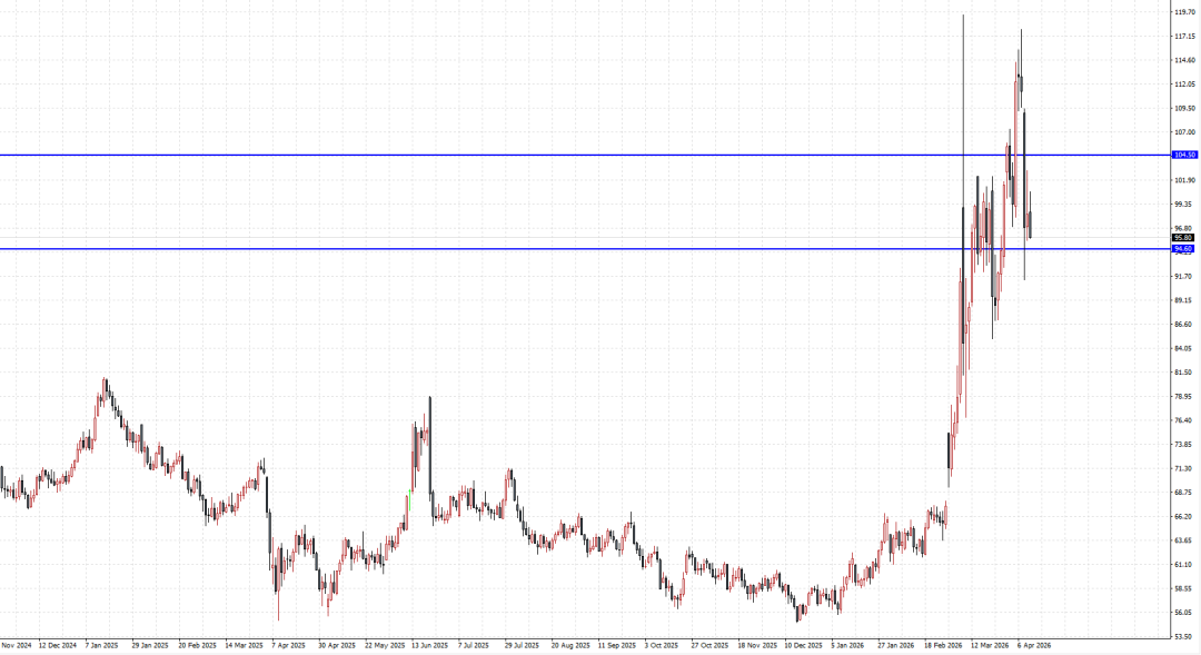 本周美国总统特朗普针对伊朗的行动引发市场对战争风险的重新评估。脆弱的停火协议虽带来短暂风险偏好回暖,但伊朗方面对协议执行的抱怨以及美国和以色列的强硬表态,持续压制市场乐观情绪。整体盘面显示,尽管停火协议消息发布后引发油价自周内高点117.57美元大幅回撤至91美元一线,但地缘不确定性仍令市场维持相对谨慎。地缘政治因素与风险情绪联动显著,美伊两周停火协议虽暂缓冲突,但伊朗关闭霍尔木兹海峡的举动以及后续谈判的不确定性,仍推高油价波动。恐慌指数VIX波动率保持敏感,美股尤其是纳斯达克在风险偏好回暖时提供间接支撑,但任何停火破裂迹象都可能迅速推升油价。